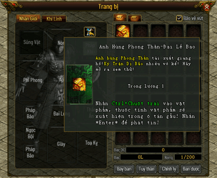 Tất cả nhân vật khi mới gia nhập Phong Thần đều nhận được 1 “Anh Hùng Phong Thần - Đại Lễ Bao” trong Túi hành trang (F4) của mình.