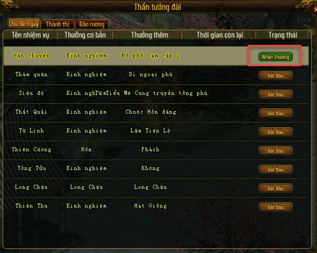 Sau khi Thần Tướng hoàn thành nhiệm vụ được giao, anh hùng nhấn vào nút “Nhận Thưởng” để trả nhiệm vụ và nhận phần thưởng.