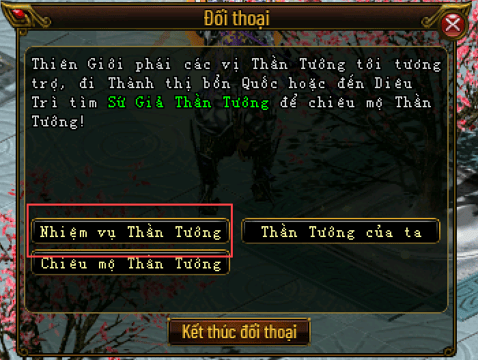 Đến Diêu Trì gặp Sứ Giả Thần Tướng (193,197) mở giao diện Nhiệm vụ Thần Tướng.