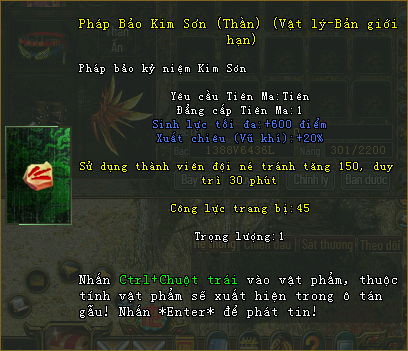 Lễ bao Pháp bảo Kim Sơn (Tiên Ma) mở ra có thể chọn nhận 1 trong các loại pháp bảo sau:
