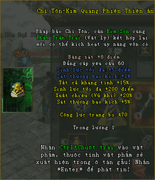Các loại pháp bảo đặc biệt có thể kết hợp để kích hoạt thành Pháp Bảo Chí Tôn (6 thuộc tính), hãy tìm Linh Bảo Đại Pháp Sư tại Ngọc Hư Cung để tìm hiểu.