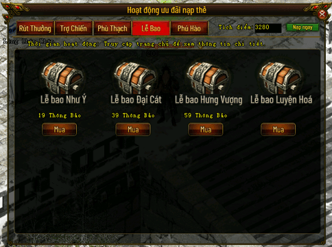 Lưu ý: Nhằm duy trì sự cân bằng của trò chơi, tại Máy chủ mới có thể có các giới hạn, không thể mua 1 số loại Lễ bao.